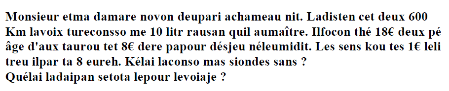 Face à ce texte, vous vous imaginez que suite à une erreur de l’ordinateur, tous les espaces ont disparu du texte. Or, en regardant autour de vous, vous découvrez que tous les élèves ont cette même feuille et que personne ne fait de remarque. Tout semble naturel et normal. Chacun répond rapidement à la question. Certains ajoutent même : « oh, c’est facile! ». Vous vous dandinez sur votre chaise, mal à l’aise. Là encore, le surveillant vous fait signe de vous tenir tranquille.